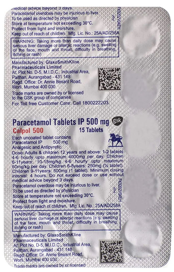 Calpol 500 + Tablet helps relieve pain and fever by blocking the release of certain chemical messengers responsible for fever and pain. It is used to treat headaches, migraine, toothaches, sore throats, period (menstrual) pains, arthritis, muscle aches, and the common cold.