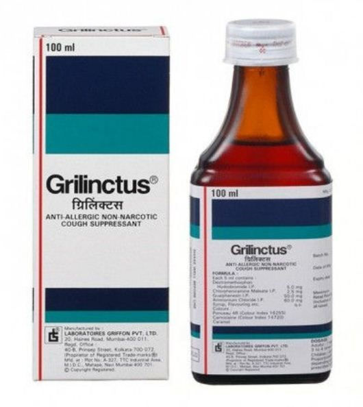 Grilinctus-DX Syrup is a combination of two medicines used in the treatment of dry cough. It can provide temporary relief of cough due to throat irritation, sneezing, and running nose. It works by reducing the activity of the brain's cough center and blocking the effects of histamine.
