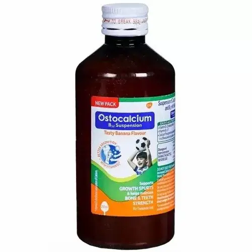 Adequate Calcium is required for maintaining bone & teeth strength. If your child's daily diet does not have adequate calcium, your child may need calcium supplementation. Indian dietary habits contribute to low intake of calcium & vitamin D increases the risk of deficiency. Deficiency of calcium & vitamin D negatively affects bone & teeth health. Indian Academy of Pediatrics recommends calcium along with Vitamin D for growing children. Calcium & Vitamin D are critical for bone & teeth development. Ostocalcium B12 Suspension gives your growing child calcium which is required to maintain the strength of bones & teeth. It has Vitamin D3 that aids calcium absorption in the body. Without Vitamin D3, calcium absorption is not optimum. It also contains Vitamin B12 which is important for the release of energy in the body. Every 5 ml (1 teaspoonful) of Ostocalcium B12 suspension contains 82 mg of elemental calcium; 200IU of Vitamin D3 & 2.5 mcg of Vitamin B12. Ostocalcium B12 Suspension comes in a tasty Banana flavour which your kids will enjoy. Consult your doctor before administering Ostocalcium B12 Suspension to children below 1 year of age. For children more than 1 year of age, the recommended dosage is 1-2 teaspoon daily.